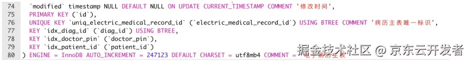 PRIMARY KEY (id), UNIQUE KEY uniq_rx_id (rx_id), KEY idx_diag_id (diag_id), KEY idx_doctor_pin (doctor_pin) USING BTREE, KEY idx_rx_storeId (store_id), KEY idx_parent_rx_id (parent_rx_id) USING BTREE, KEY idx_rx_status (rx_status) USING BTREE, KEY idx_doctor_status_type (doctor_pin, rx_status, rx_type), KEY idx_business_store (business_type, store_id), KEY idx_doctor_pin_patientid (patient_id, doctor_pin) USING BTREE, KEY idx_rx_create_time (rx_create_time)