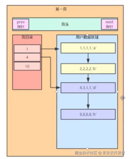 2)页目录这个是用来指向具体的用户数据区域,因为当用户数据区域的数据变多的时候也就会形成分组,而页目录就会指向不同的分组,利用二分查找可以快速的定位数据。
