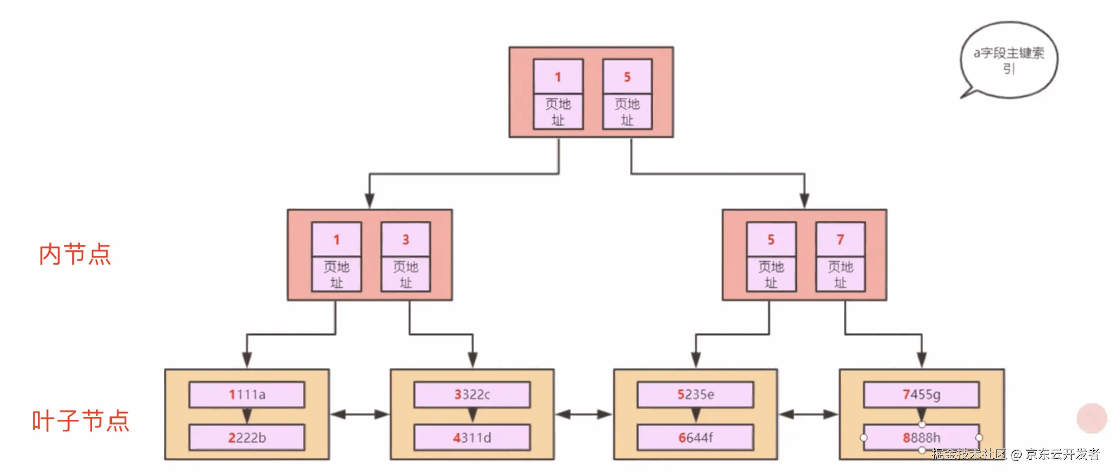 最下边的一层叫做叶子节点,上边的叫做内节点,而叶子节点中存储的是全量数据,这样的树就是聚簇索引。一直有同学的理解是说索引是单独一份而数据是一份,其实MySQL中有一个原则就是数据即索引、索引即数据,真实的数据本身就是存储在聚簇索引中的,所谓的回表就是回的聚簇索引。