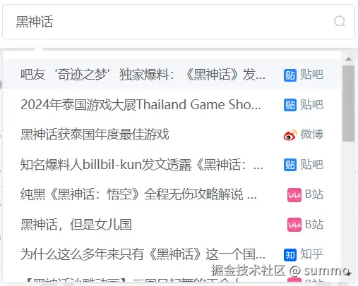搜索组件使用的是<el-autocomplete>,使用方法看API文档就可以了。组件不难,唯一要注意的是搜索出来的结果内容是可能会重复的,所以我们需要对结果加一个来源标识。