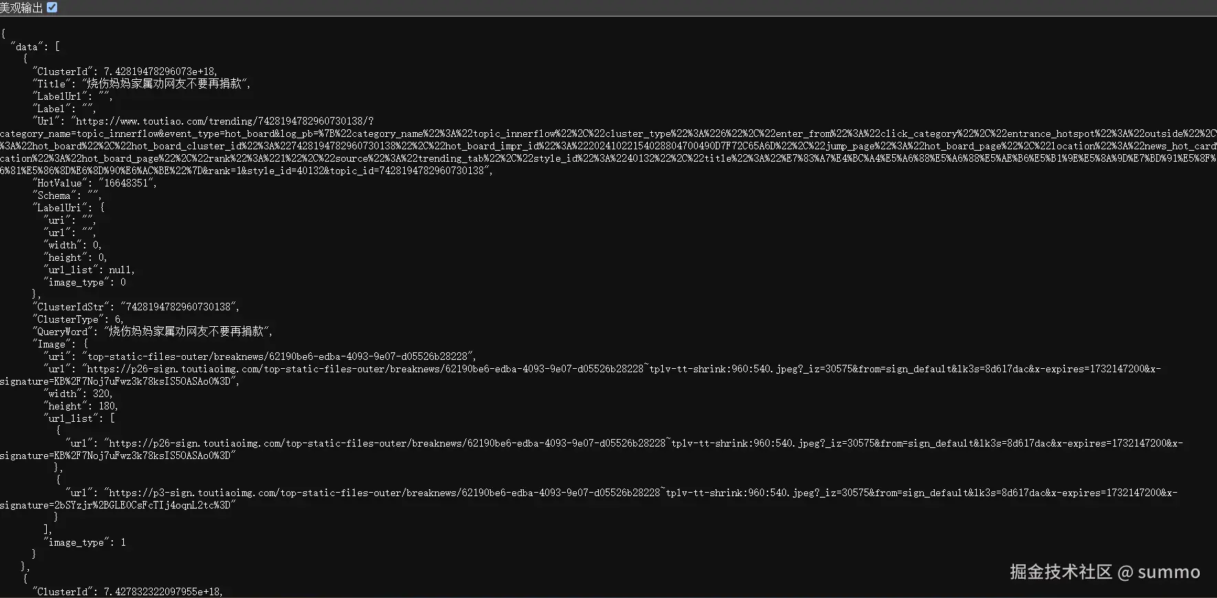 头条的热搜接口返回的一串JSON格式数据,这就很简单了,省的我们去解析dom,访问链接是:[www.toutiao.com/hot-event/h…)