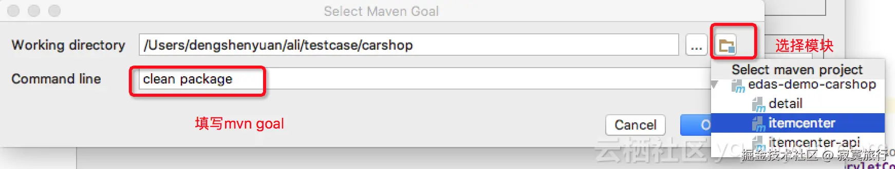 在弹出的界面上,可以点击文件夹小图标来选择模块,在"Command line"上填写mvn goal: