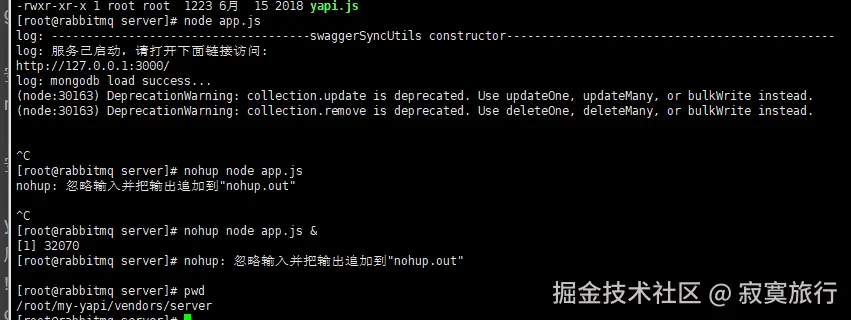 然后在服务端进入yapi安装目录(上一步填写的部署路径),使用命令node app.js 启动服务,启动之后提示如下: