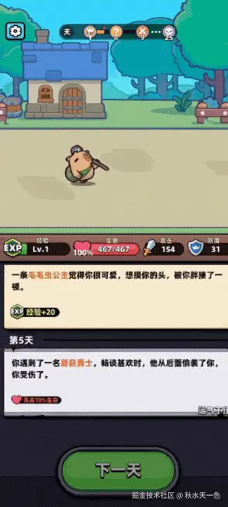 玩家要做的事不多,点击“下一天”、升级选技能以及选择随机遭遇等就包含了游戏中的大部分操作,之后便是看自己(卡皮巴拉)如何在一次次的冒险后掌控更多的技能变得更加强大从而活得更久了。