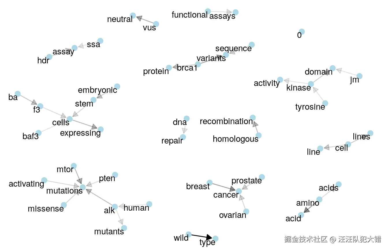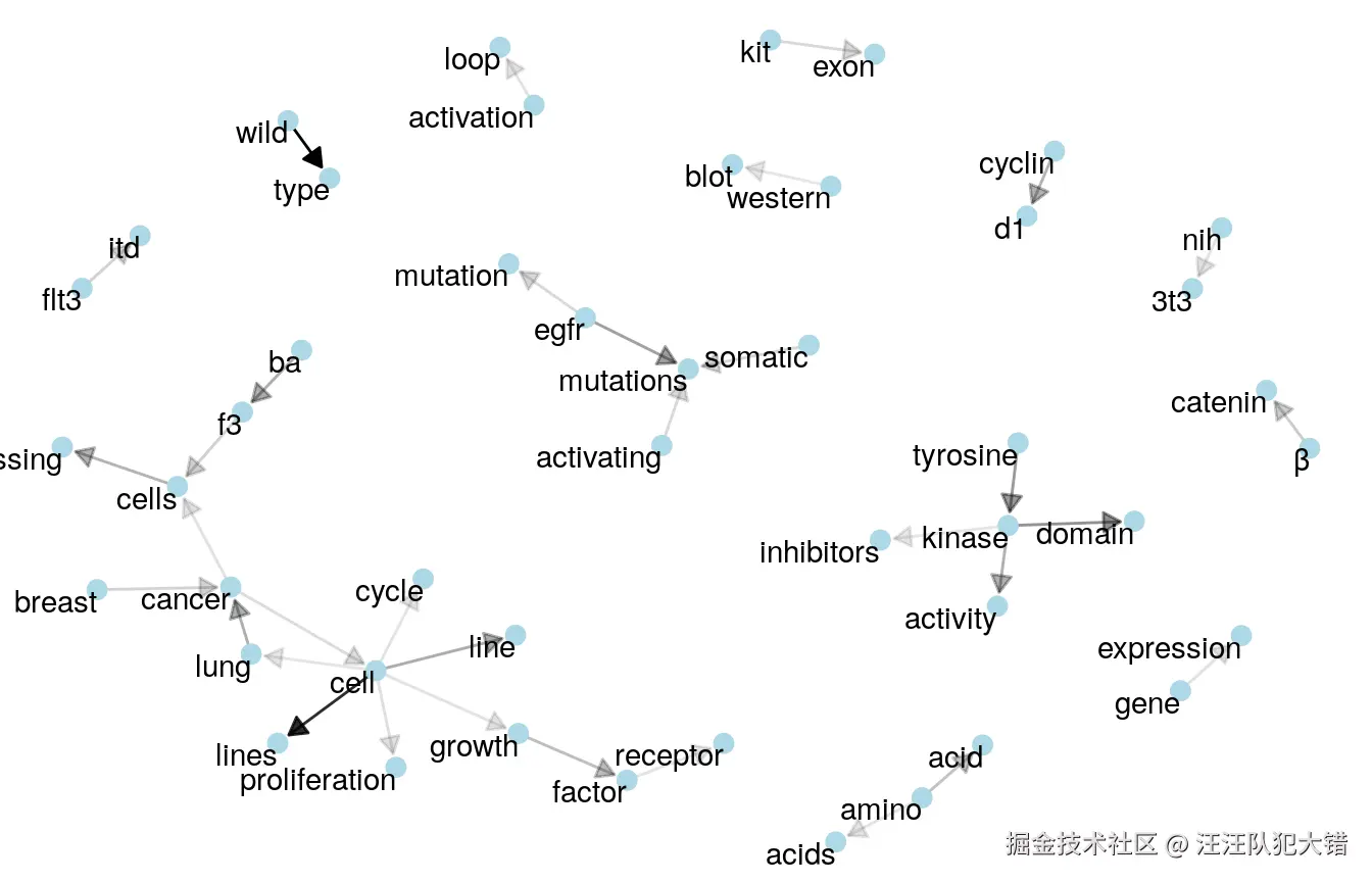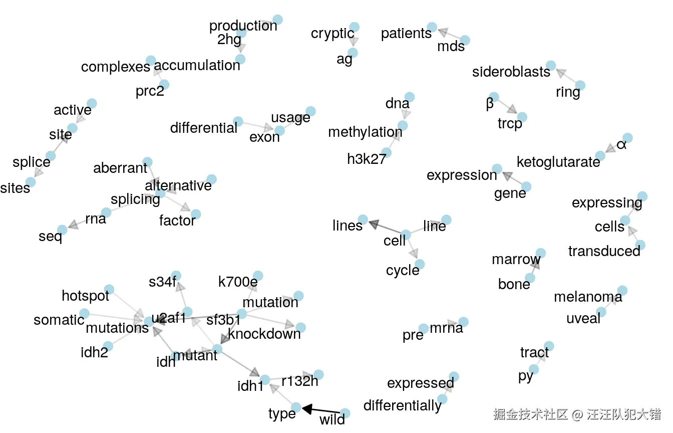 这里的箭头表示关系一词的方向(例如“基因表达”而不是“表达基因”)。根据这些链接箭头出现的频率,将其应用于透明度(罕见的箭头更透明)。