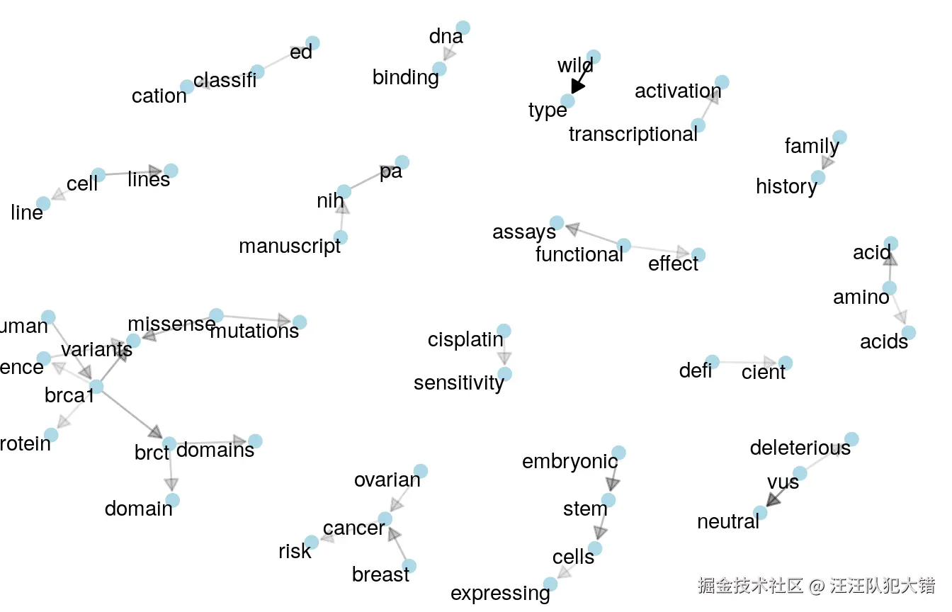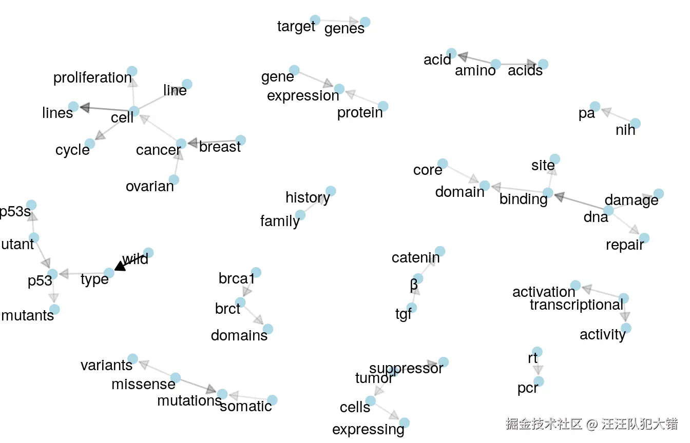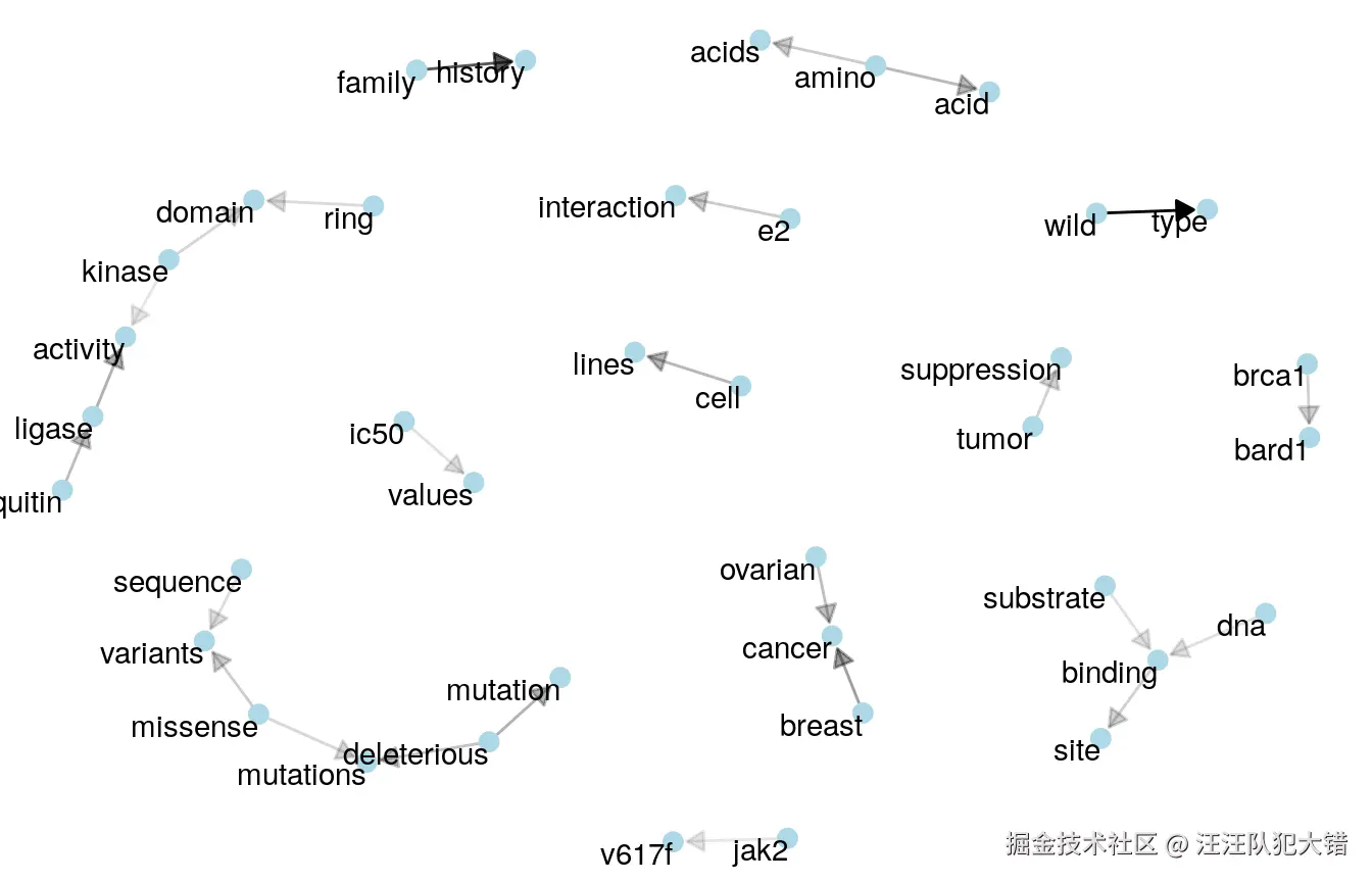 这里的箭头表示关系一词的方向(例如“基因表达”而不是“表达基因”)。根据这些链接箭头出现的频率,将其应用于透明度(罕见的箭头更透明)。