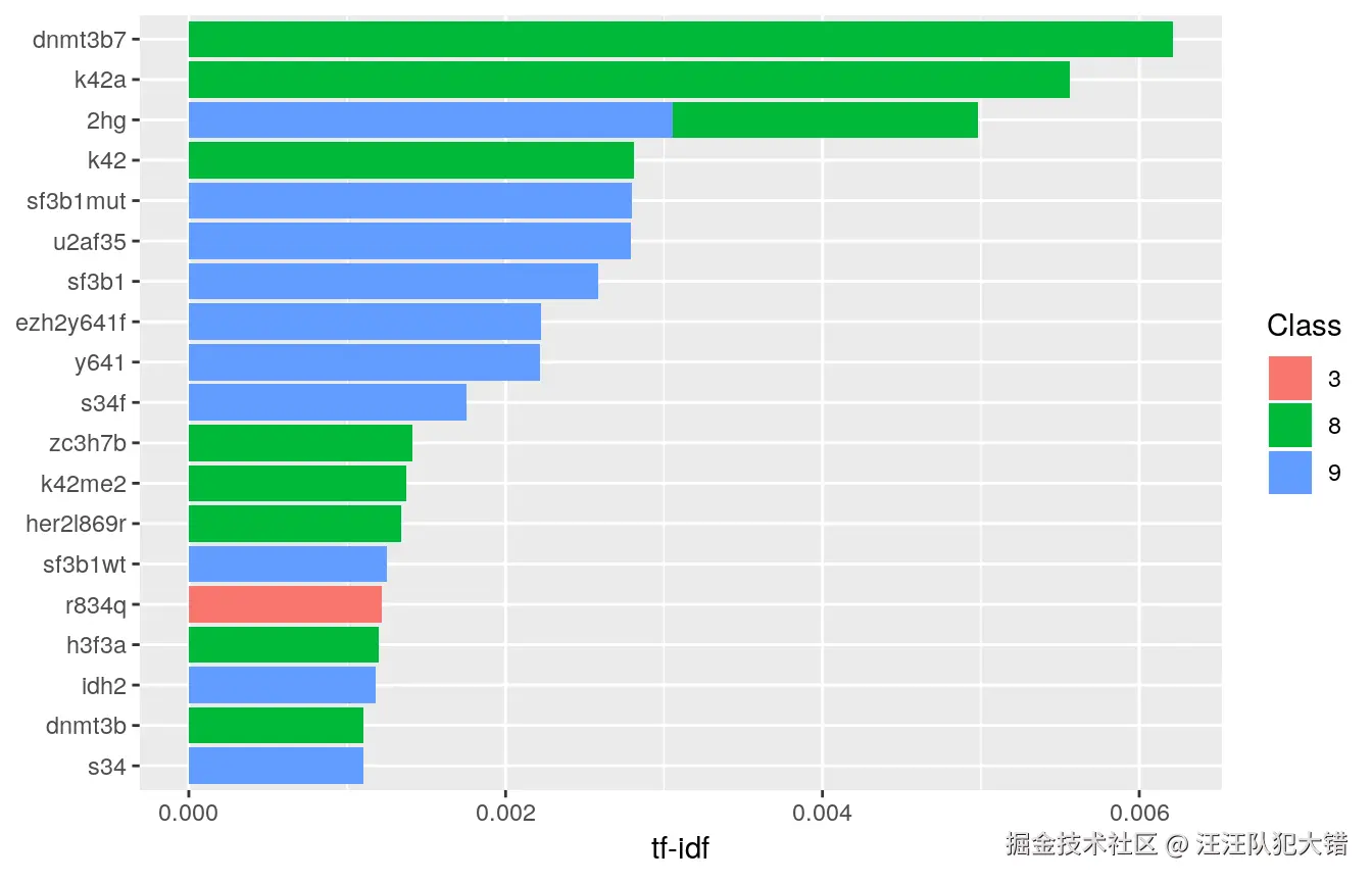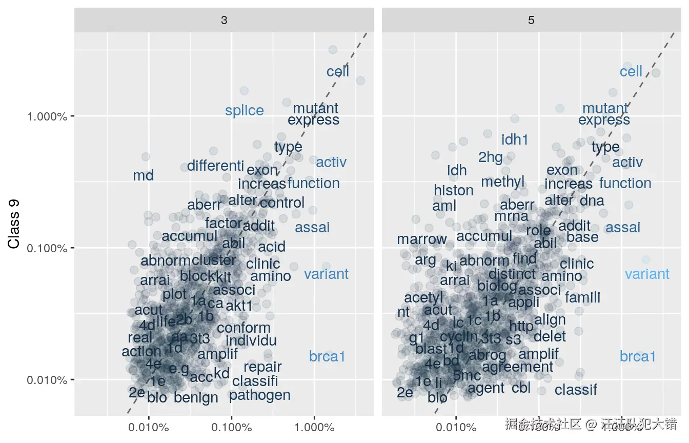 注意,这里我们没有将相似的单词归约为相同的词干,这导致了类内相似的出现(例如Class == 8中的“dnmt3b7表达”和“dnmt3b7表达”)。尽管如此,总的来说,类的内容看起来足够不同,对预测有用。