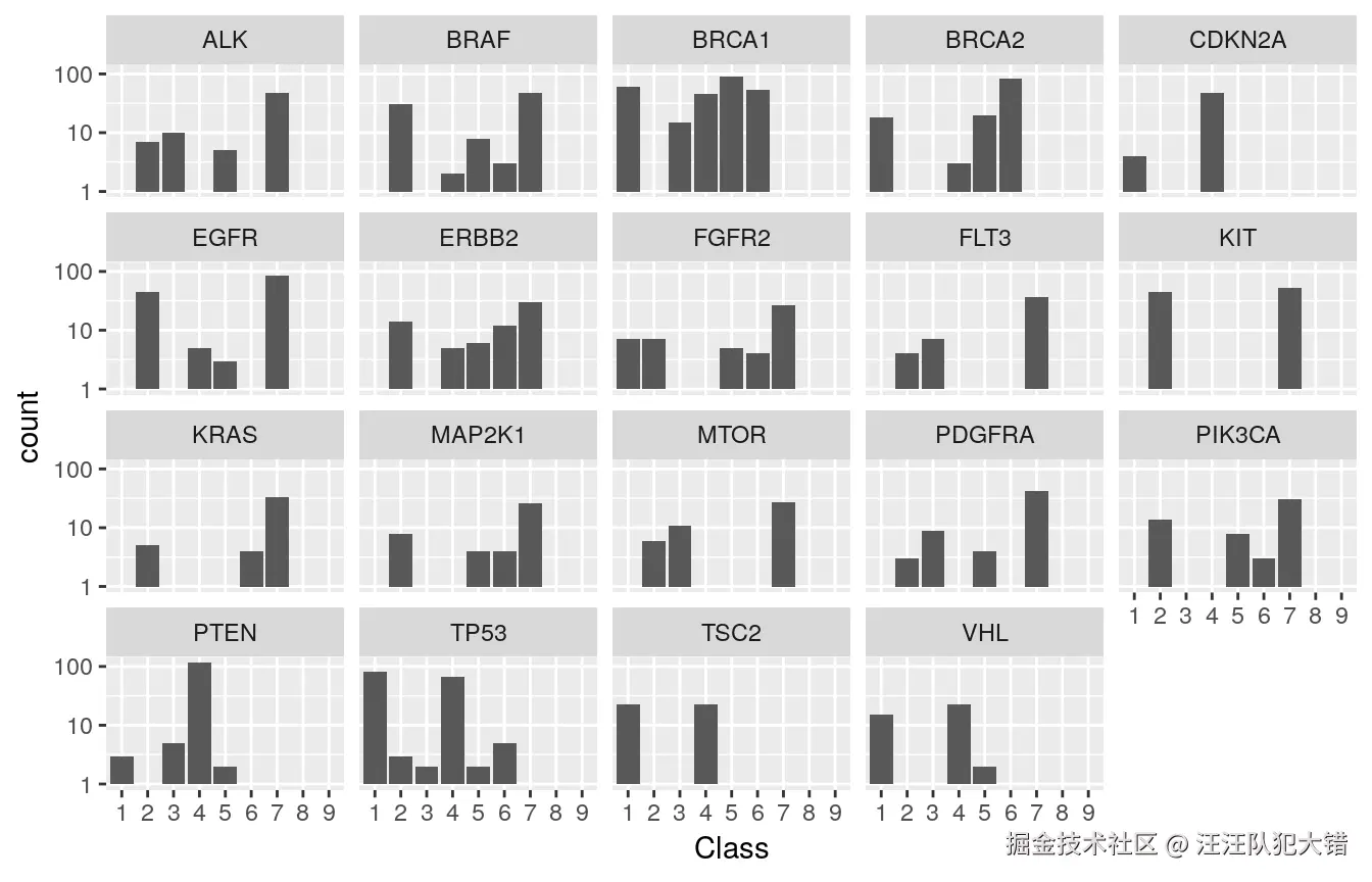 首先,我们将查看不同类别的总体最频繁基因的频率分布。注意对数频率标度。