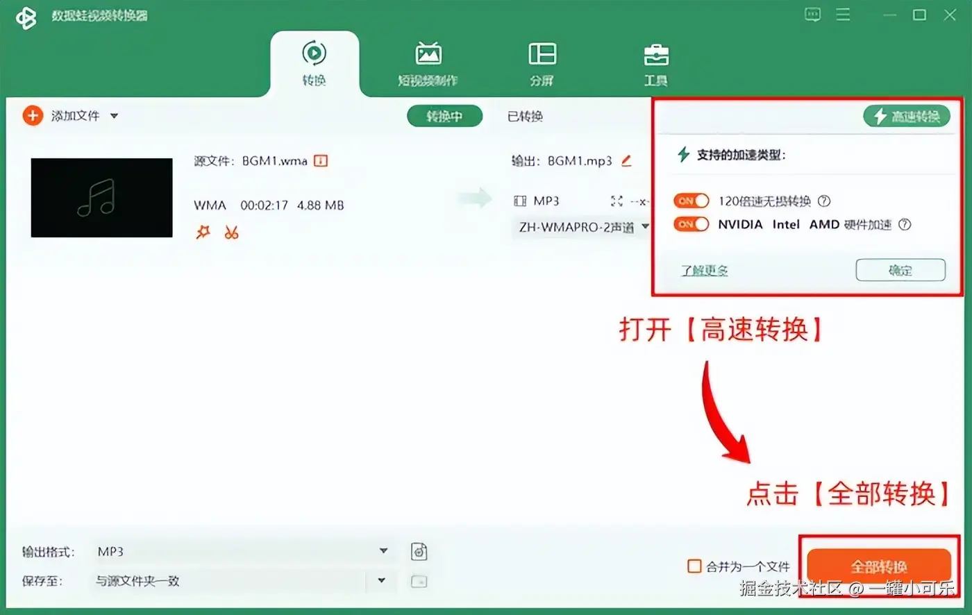 步骤3:返回WMA转MP3格式界面中,打开【高速转换】,然后点击【全部转换】即可开始音频格式转换进程。
