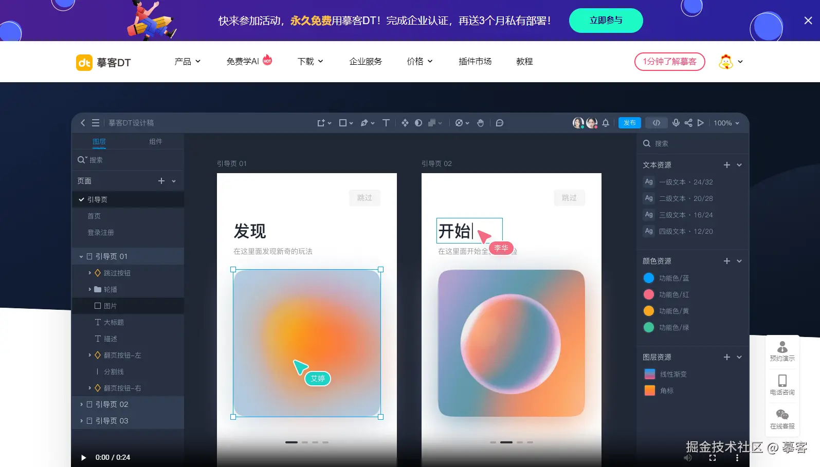**推荐理由:**与一些老牌设计工具相比(Photoshop、XD等),摹客DT的学习门槛更低,上手更简单,社区和实时客户支持更迅速友好;作为Web端工具,摹客DT支持多人实时编辑,大大提高了团队设计效率。