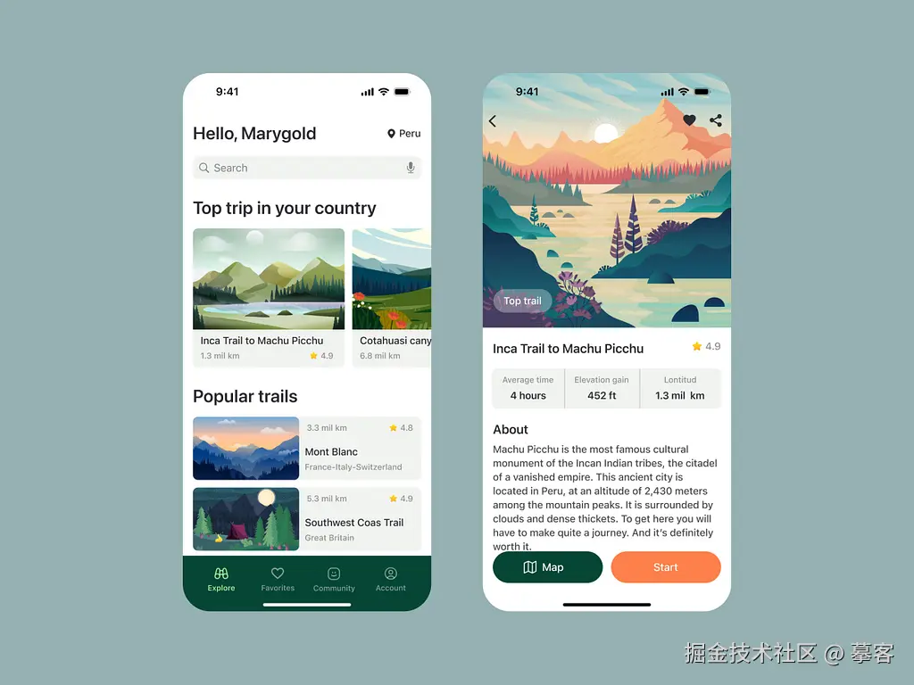 这款户外旅行APP,采用了清新的绿色为主色调,搭配直观的图标和简约的地图导航,整个设计让人感到自然和放松。无论是查找路线、天气信息还是景点推荐,都能一目了然,设计实用而不失美观。