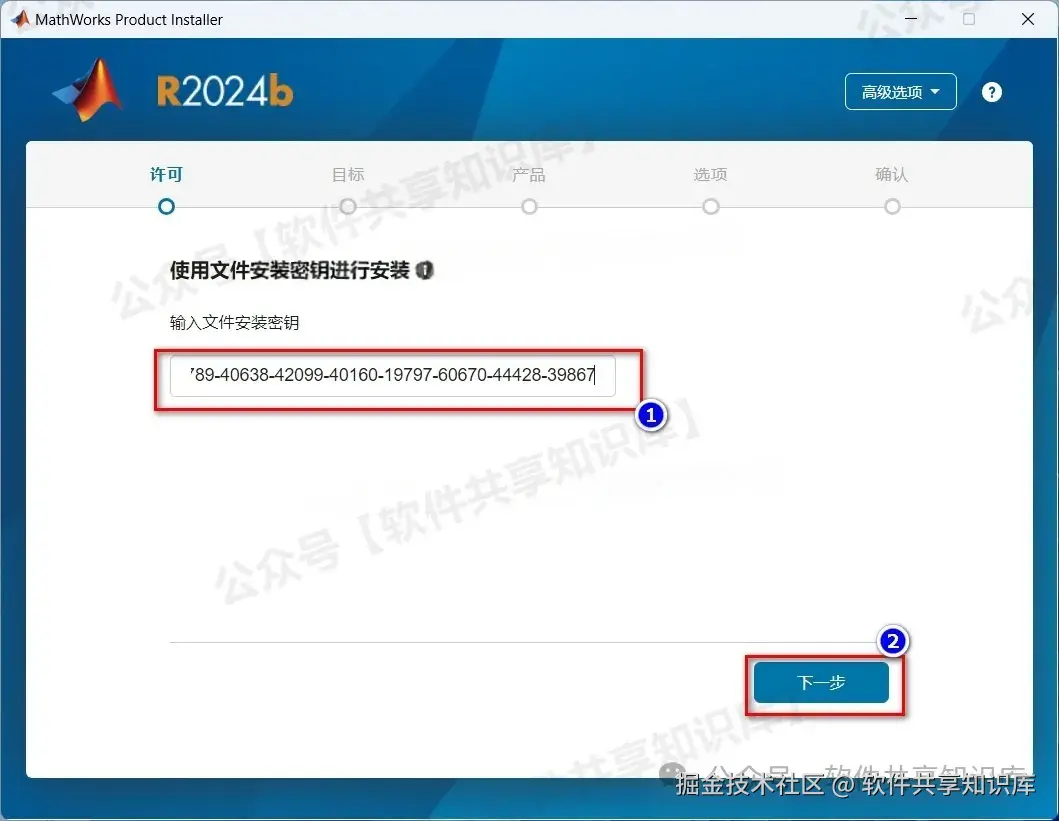 6.复制以下标红秘钥并粘贴输入【39676-02743-14813-63132-22122-21739-42724-01237-08353-51560-41813-30272-46436-42021-53831-05395-21684-43572-58789-40638-42099-40160-19797-60670-44428-39867】,点击【下一步】。