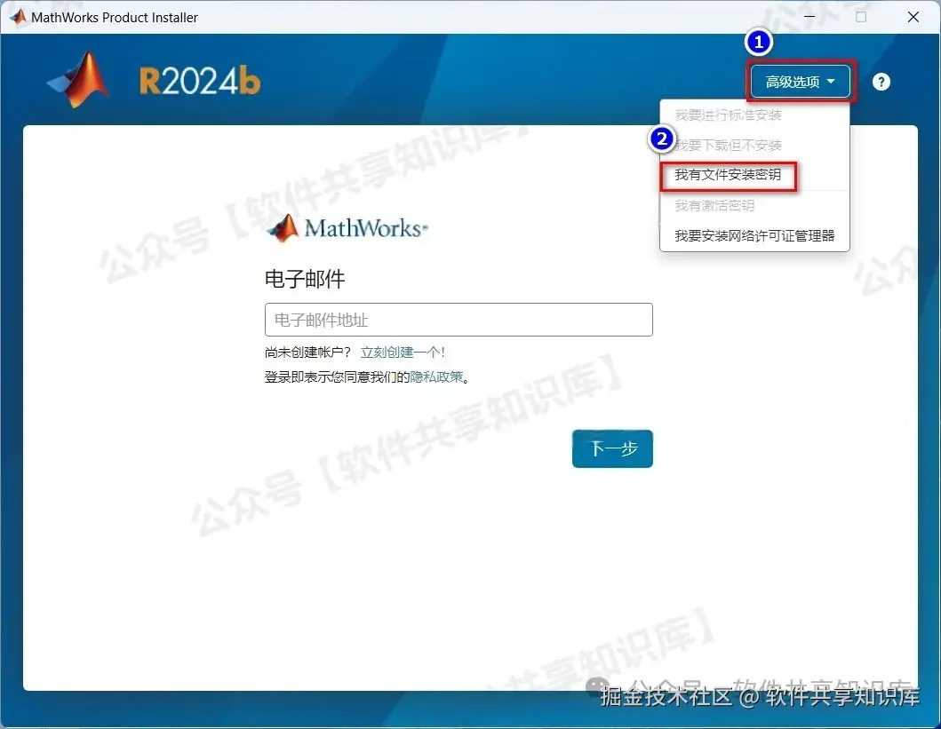 4.点击右上角的【高级选项】,选择【我有文件安装密钥】。