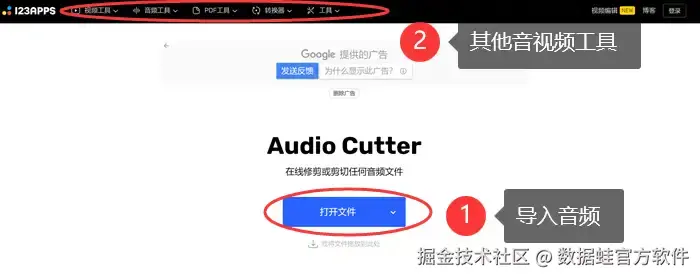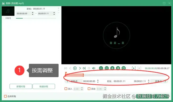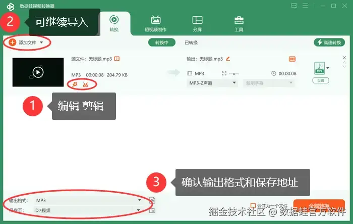 第一步: 打开数据 蛙,点 【添加文件】 导入音频文件后,点击 【剪刀】 图标对音频文件进行剪辑等处理。