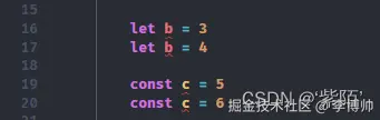 let 和 const 同一个作用域下不能重名,编辑器都提示了