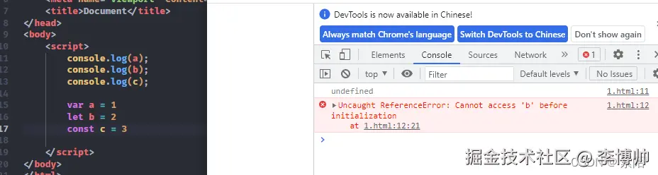 var 在 js 中是支持预解析的声明出来的就不会报错是 undefined,let,const 就会报错