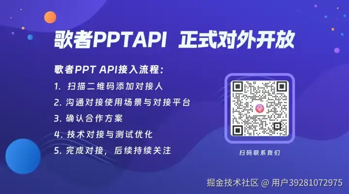 为满足各行各业用户的需求,**歌者 PPT API 现已正式对外开放!**无论是构建全新平台,还是增强现有服务,开发者都可以轻松将歌者 PPT 的强大功能集成到自己的系统中。