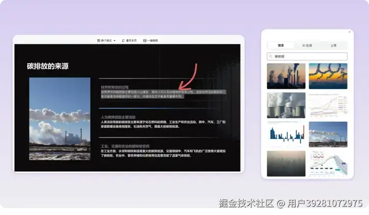生成的 PPT 可以直接在线编辑,文字修改、配图调整都非常方便。用户可以上传本地图片,也可以通过侧边栏搜索或 AI 生成所需的图片,操作简单高效。