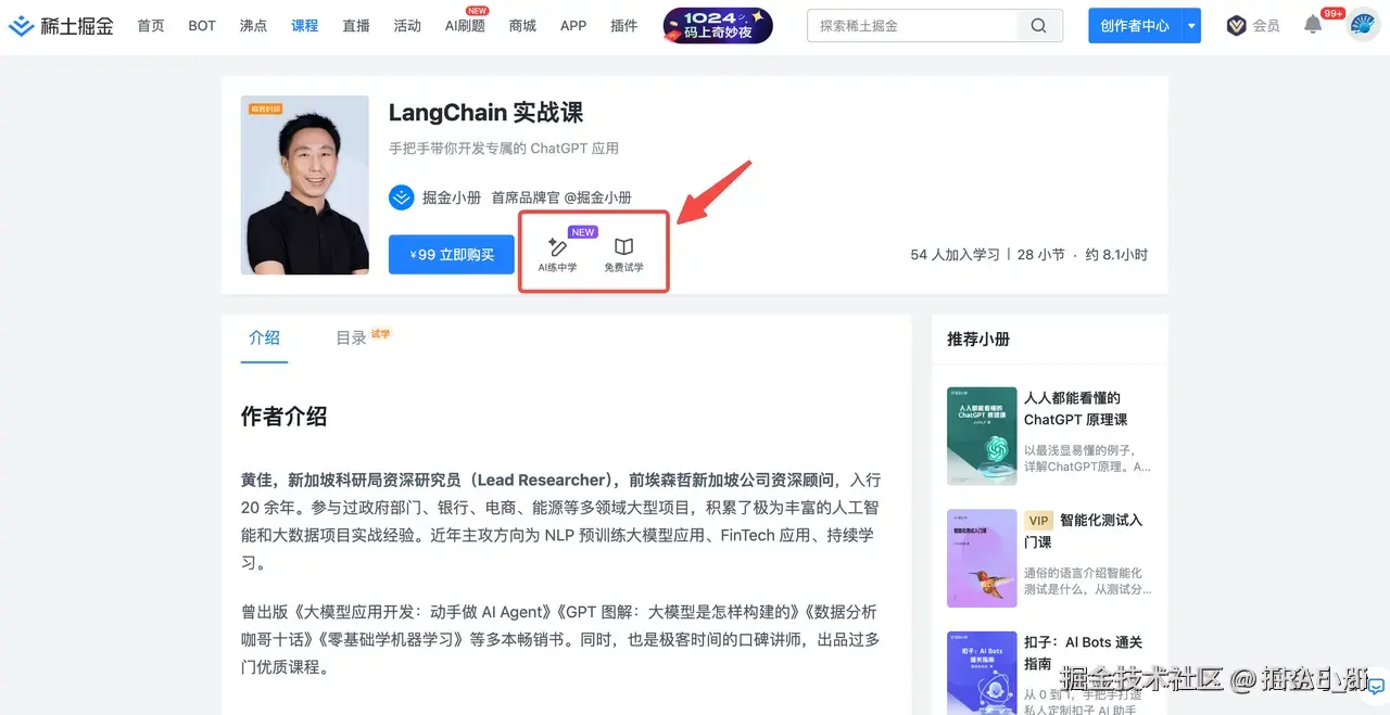 第一步: 打开《 LangChain 实战课》,体验 AI练中学