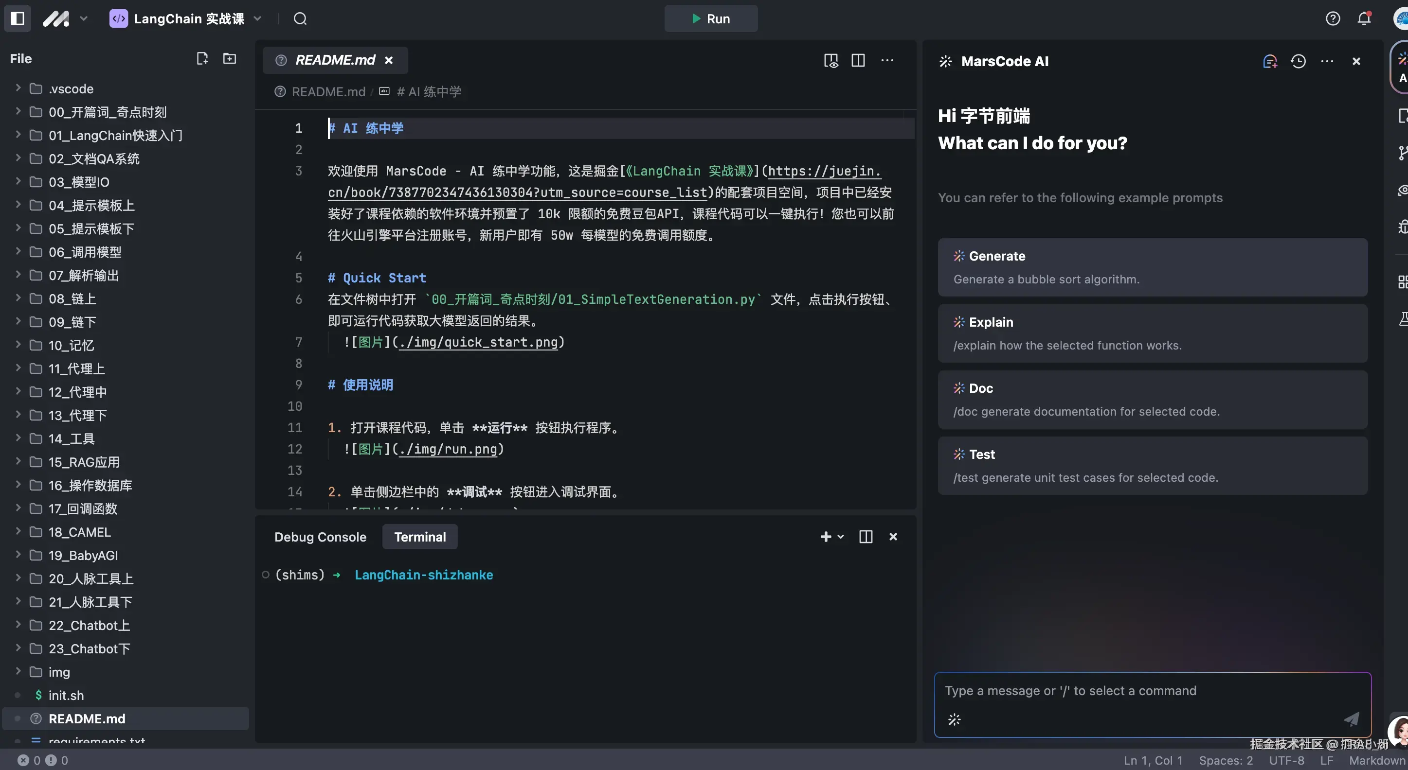 - 学习《LangChain 实战课》小册,在掘金话题#豆包MarsCode AI练中学下发布学习笔记或实际运行代码过程中遇到的问题及解决方案文章,即可成功参与。