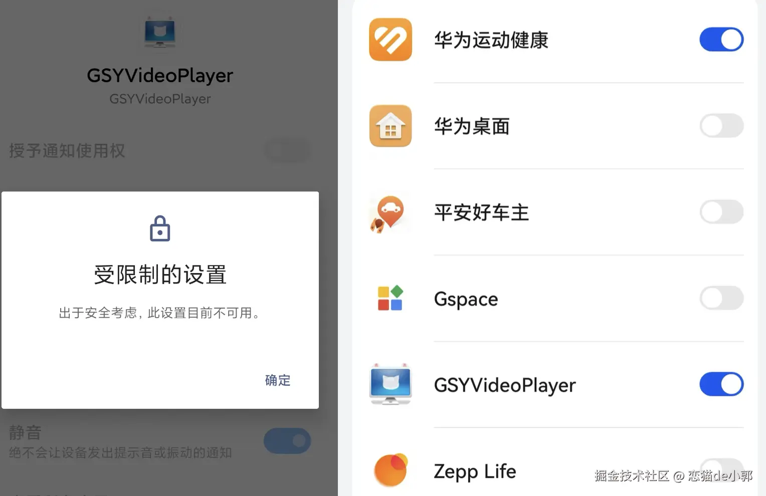 甚至有时候你还会看到下面这样的情况,例如左侧小米上出现受限的场景,另外右侧在我的华为上看到「平安好车主」也有对应权限描述在,也是有趣: