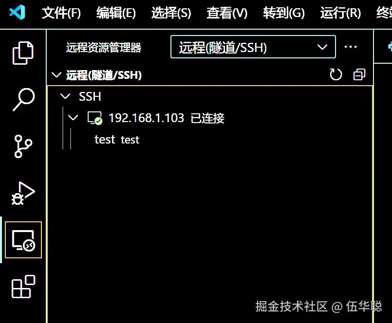 安装完毕的Remote-SSH,会在左侧的导航中有一个SSH的项目,我们添加自己的服务器的IP和用户名信息,用来连接服务器。