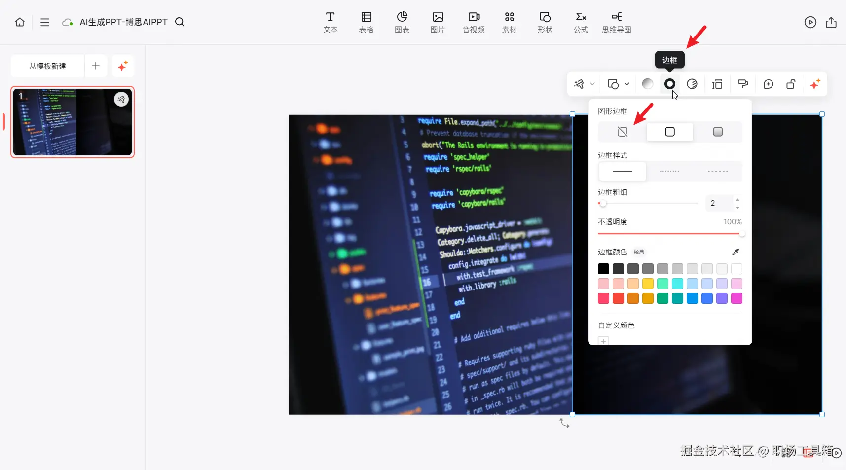 值得一提的是,插入到PPT页面的形状默认带有黑色的边框,如果想去掉边框,可以点击“边框”选项,打开调整边框样式的面板,选择“无边框”,就能一键去除形状自带的边框。