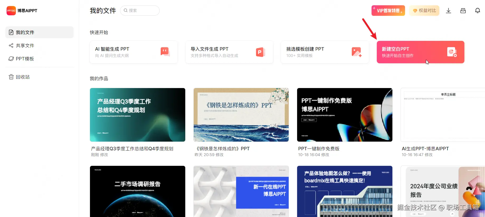 点击博思AIPPT工作台的“新建空白PPT”,创建一个新的在线PPT文件。