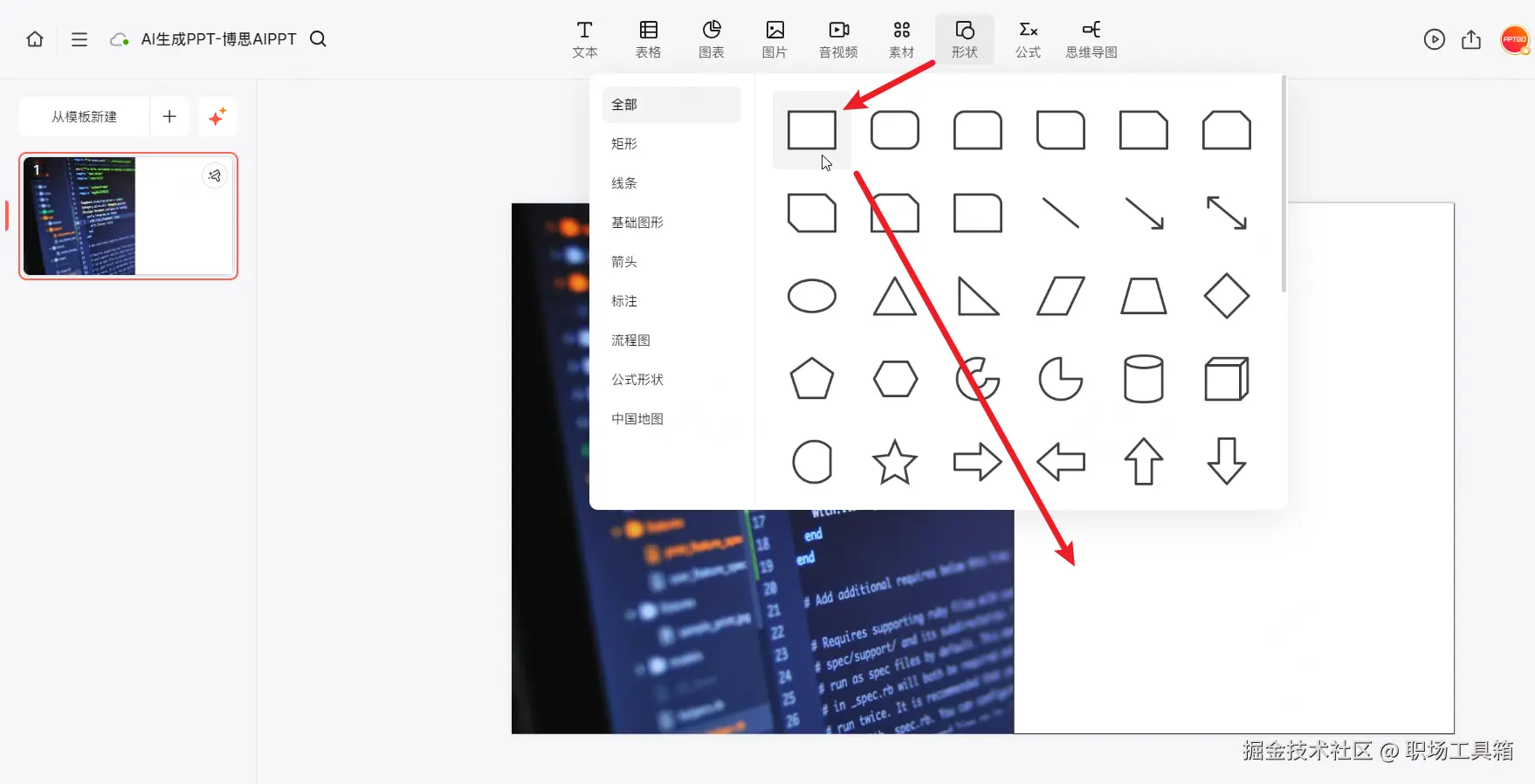 上传图片之后,点击工具栏的 “形状” 选项,选择一个合适的形状,如矩形,点击插入PPT中,将矩形调整到合适的大小和位置,覆盖在需要添加蒙版的区域。