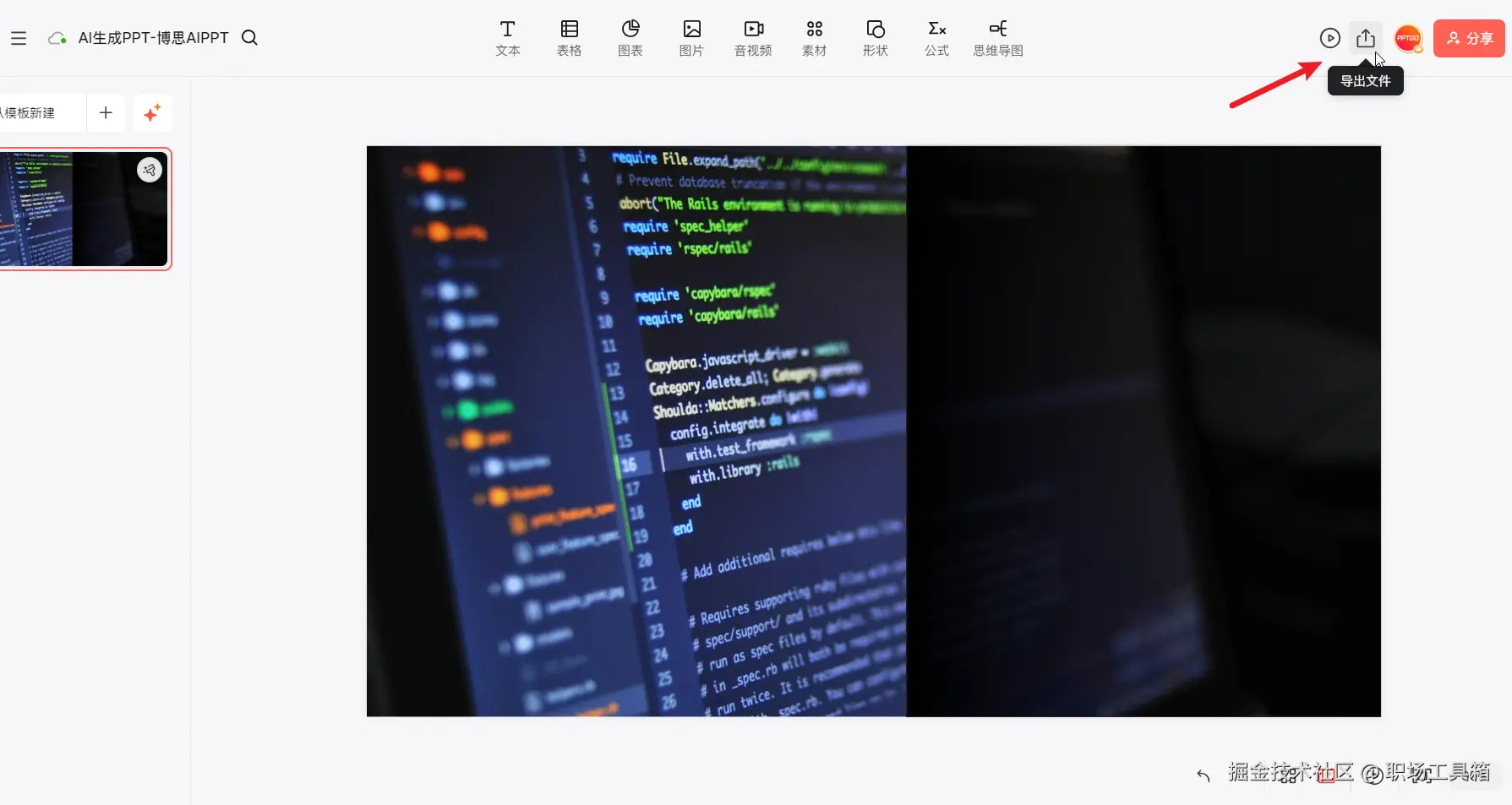 基于博思AIPPT制作的PPT会自动保存在云端,如果想把文件下载到本地,可以点击右上角的导出文件按钮,将存储在云端的PPT下载到本地。