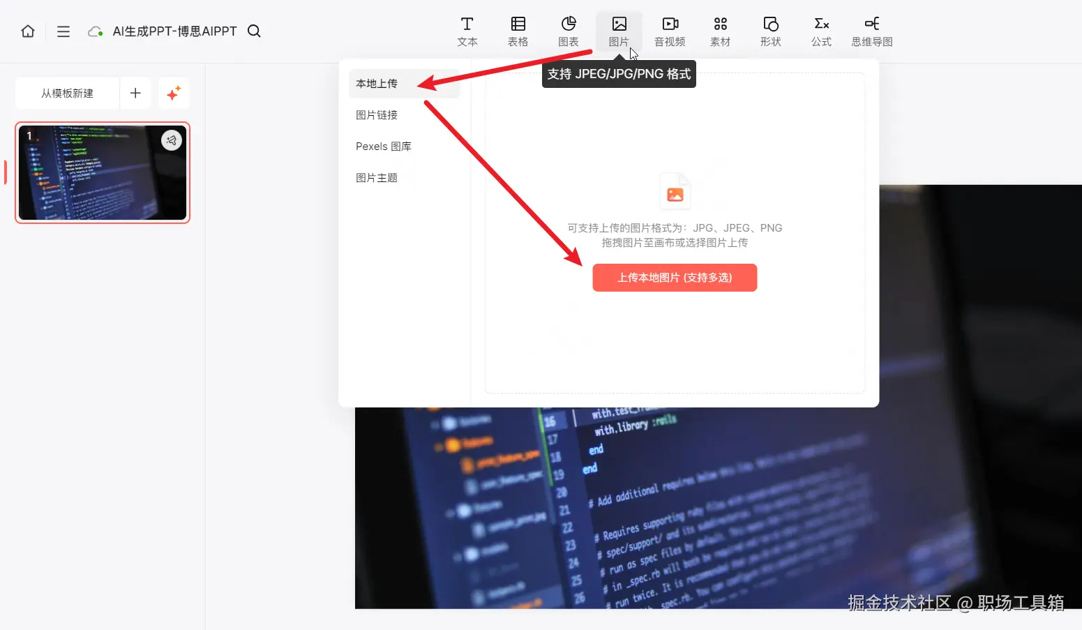 在打开的PPT文件中,点击工具栏的“图片”选项,从本地上传一张图片插入PPT中。