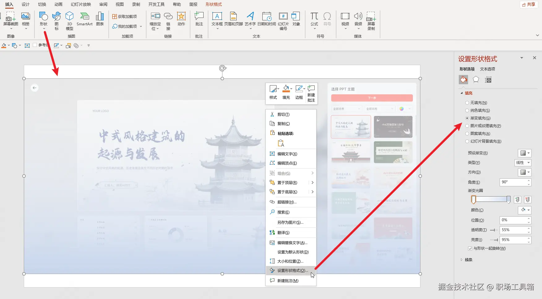 方法一,利用形状填充功能。打开PPT并选择要添加蒙版的幻灯片,在 “插入” 选项卡下选择 “形状”,挑选一个形状覆盖需要添加蒙版的区域。右键点击形状,选择 “设置形状格式”,在 “填充” 选项中选择纯色或渐变填充,然后调整透明度。