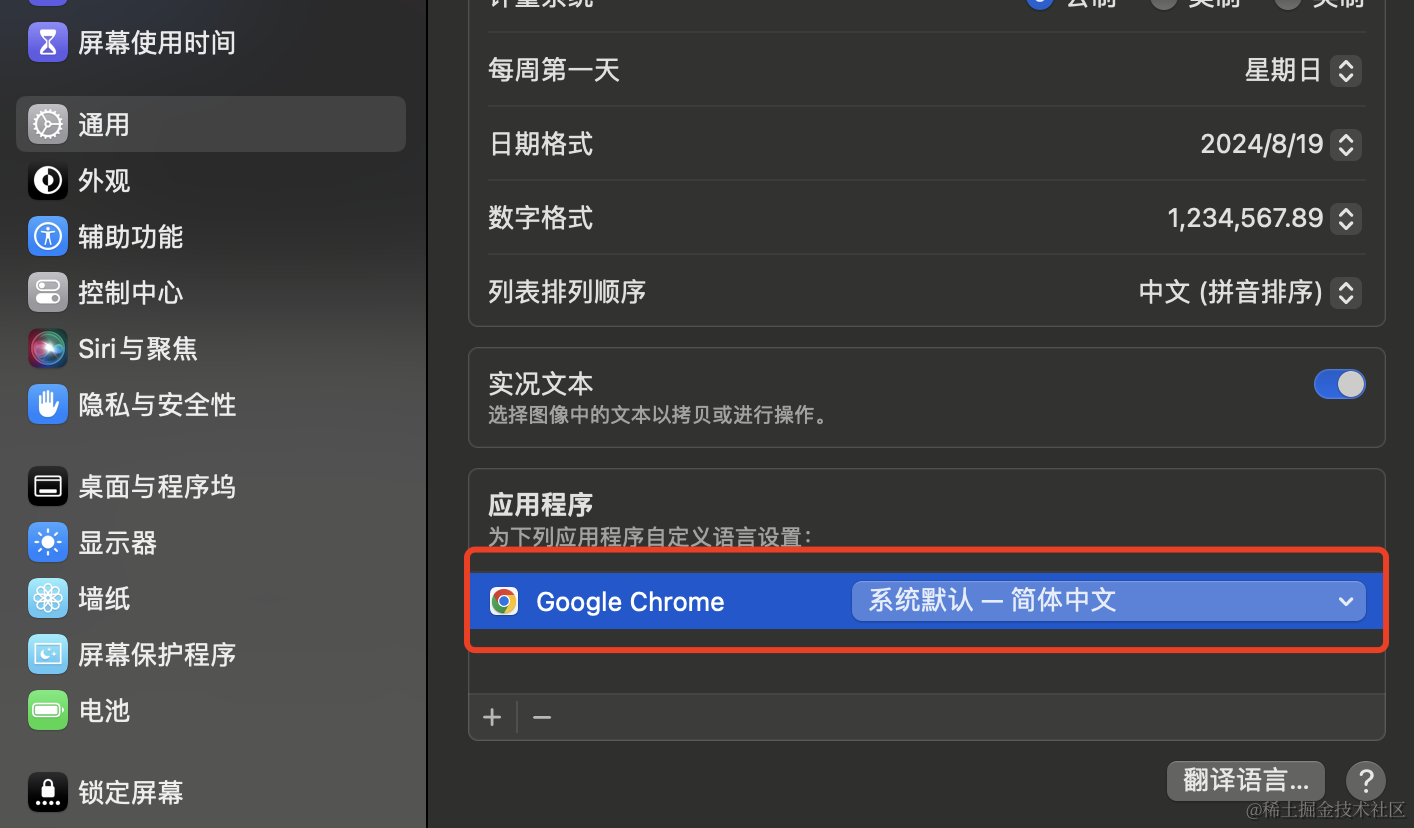 mac电脑设置chrome浏览器语言切换为日语英语等不生效问题 1024小神 2024-10-22 387 阅读1分钟 在chrome中设置了语言,并且已经置顶了,但是不生效,在windows上直接有设置当前语言为chrome显示语言,但是mac上没有。 解决办法 在系统里面有一个单独给chrome设置语言的: 单独给它设定成指定的语言,然后重新启动就可以了