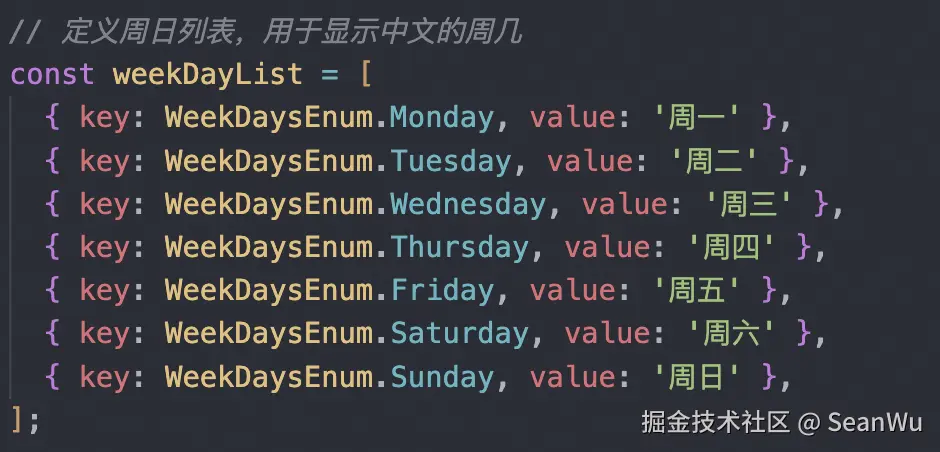 TS中枚举值的原理 SeanWu 2024-10-22 60 阅读1分钟 ts中的枚举值是个很神奇的东西,ts中其他的都可以算是类型,唯独枚举值是可以参加到js逻辑计算中 然后业务拿来用 就很神奇 的参与到业务逻辑中了 再写一个判断整周的函数 这里输入这个枚举值定义 这里发现 原来是 枚举 是以对象的形式存在