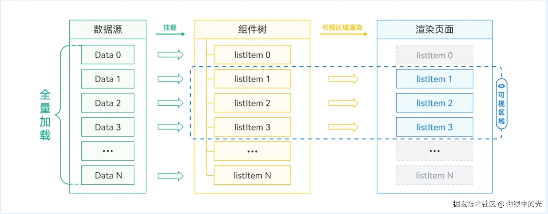 数据源将全量挂载到组件树中,为每个元素进行绘制操作
