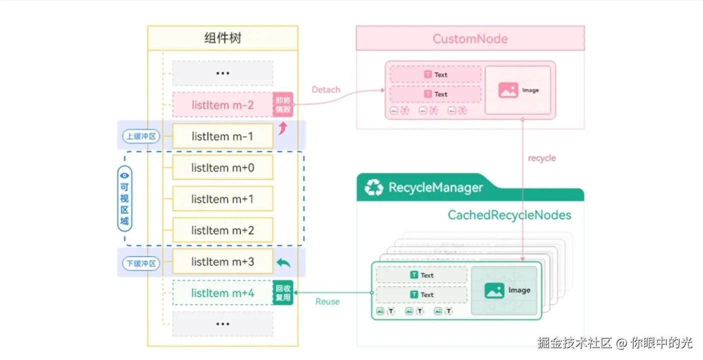 - 组件复用:提供可复用组件对象的缓存资源池,重复使用已创建过并缓存的组件对象,降低创建和销毁,提升组件渲染效率