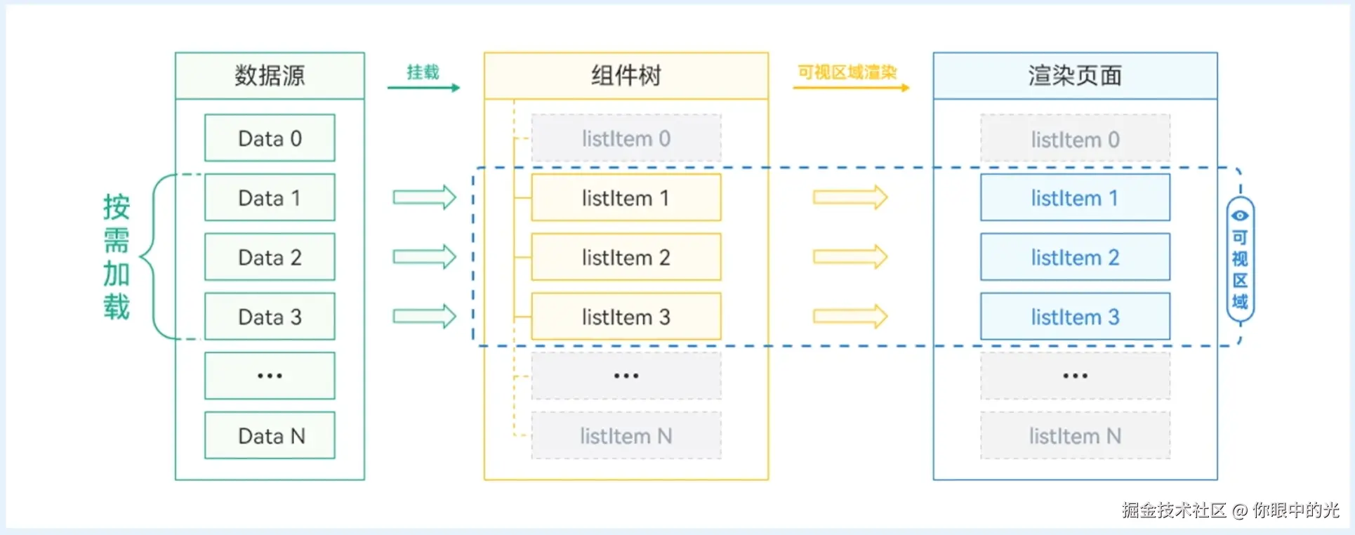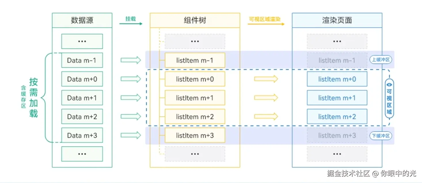 缓存列表项设置上下缓冲区,我我们将指定的数据源挂载到组件树时,会将缓存数量的数据源一起挂载到组件树,当上下滚动时,将缓存的挂载项快速渲染,当渲染完后,进行下一轮数据渲染