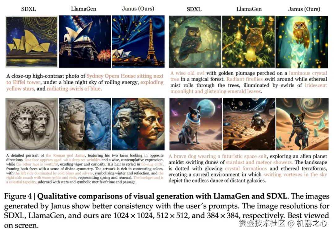 视觉生成 (Table 3 和 Table 4)。Janus-1.3B 在图像质量评价 (MSCOCO-30K 和 MJHQ-30K) 和图像生成指令跟随能力 benchmark GenEval 上都取得了很不错的结果,超越了之前同规模的统一模型,和一些专用图像生成模型,如 SDXL。