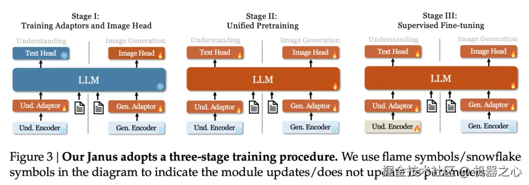 Janus 的训练分为三个阶段。(每一阶段使用的数据详情请参考 paper。整体上会控制 多模态理解 + 纯文本理解:视觉生成 = 1:1)