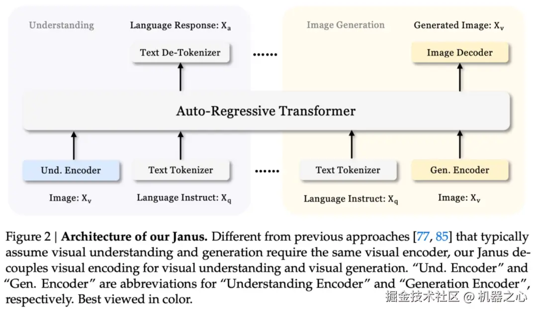 为了解决单一视觉编码器带来的性能瓶颈,我们提出了对视觉编码进行解耦。具体来说,我们使用两个独立的视觉编码器分别负责多模态理解和生成任务,然后用一个统一的 Transformer 结构去处理不同的输入信息。