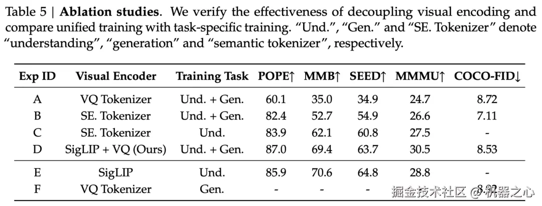 我们设计了严格的消融实验,一方面对 Janus 的视觉编码解耦这一观点进行验证,另一方面,研究联合训练对单任务训练的性能影响。