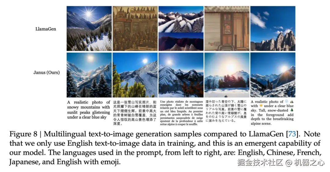 如 Figure 8 所示,我们还意外地发现,及时训练数据中只有英文文生图数据,但最后的模型涌现出了多语言文生图能力,如中文、法语、日语、甚至使用 emoji 🐶 都可以。我们认为这里的涌现能力来自于 LLM 预训练模型。