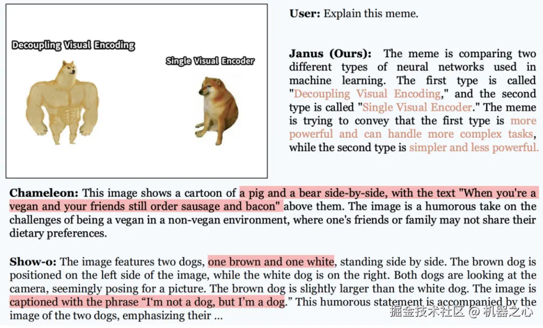 请见以下两张图,相比于以前的大一统模型,我们的模型更聪明,能读懂 meme 图像。同时还能处理 latex 公式转换、图转代码等任务。