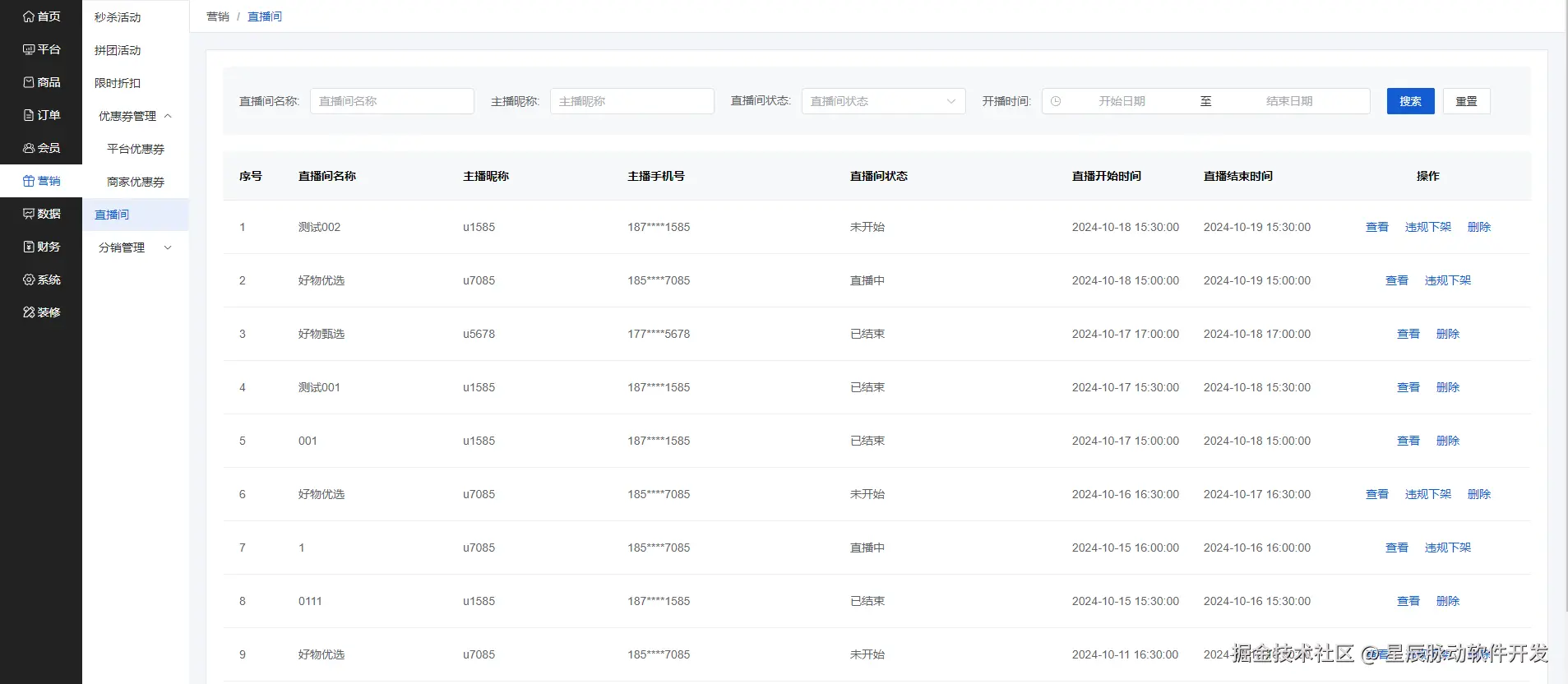点击查看可以查看直播间的信息,点击违规下架写完理由后可以下架直播间,也可以删除对应直播间.