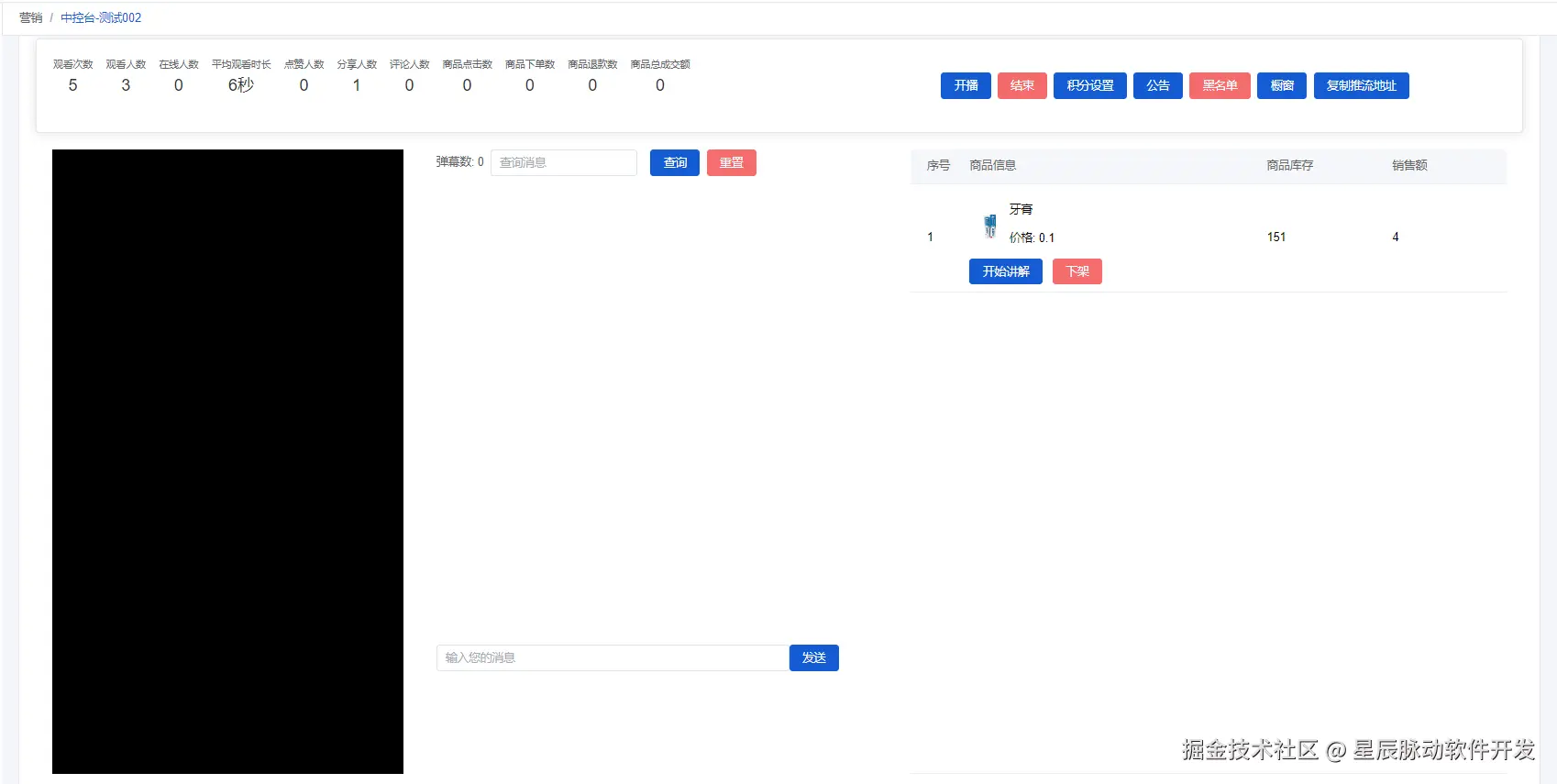 点击中控台可以查看和设置直播间的内容,包括直播间视频值,直播间评论信息,直播间商品。还有一些开播,结束,积分设置,公告,橱窗等功能。底部还有有关在线人数、销售、团队的统计。