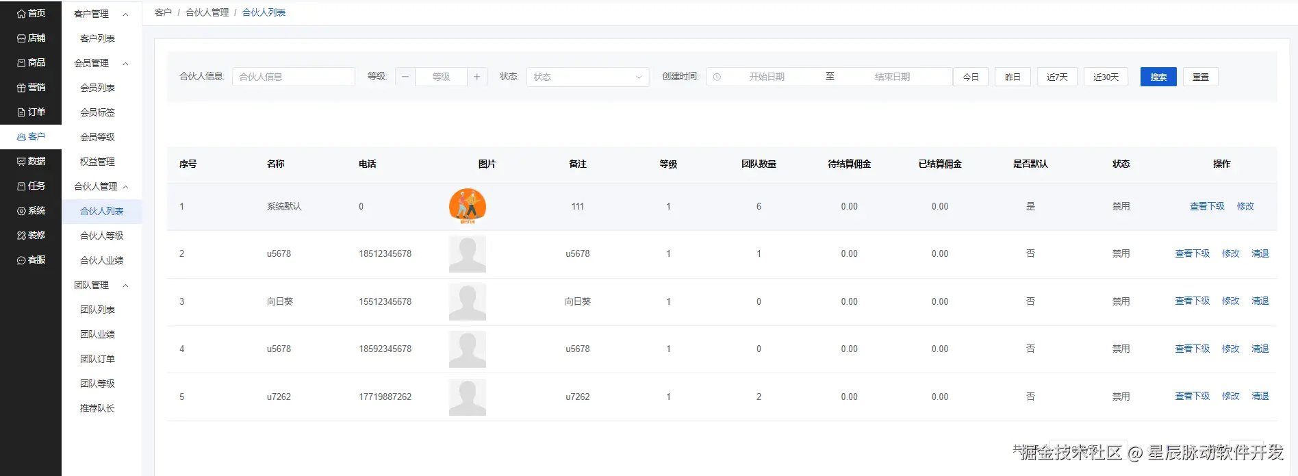 当设置为合伙人的时候,可以在合伙人列表查看对应的账号。点击查看对应的所属的下级团队长账号。同时也可以点击修改账号信息,和清退账号。也可以点击查看合伙人等级和合伙人业绩。