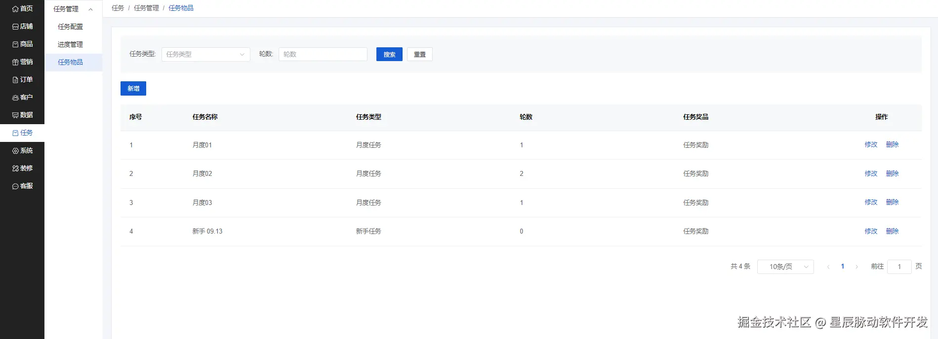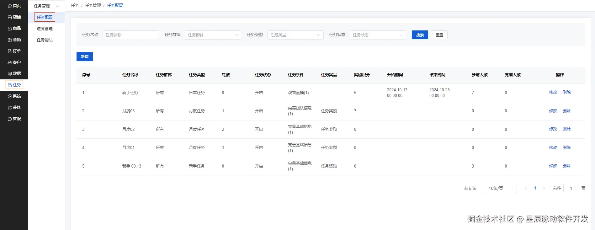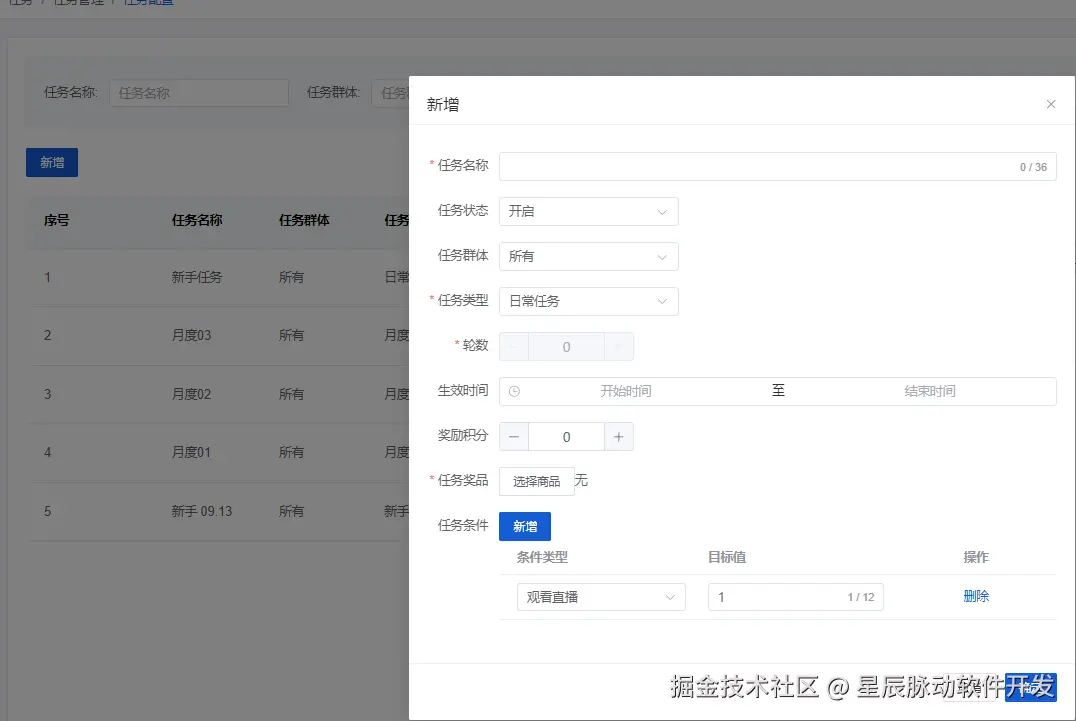 可以设置任务名称,任务状态,任务群体,任务类型,轮数,生效时间,奖励积分,任务奖品和任务条件