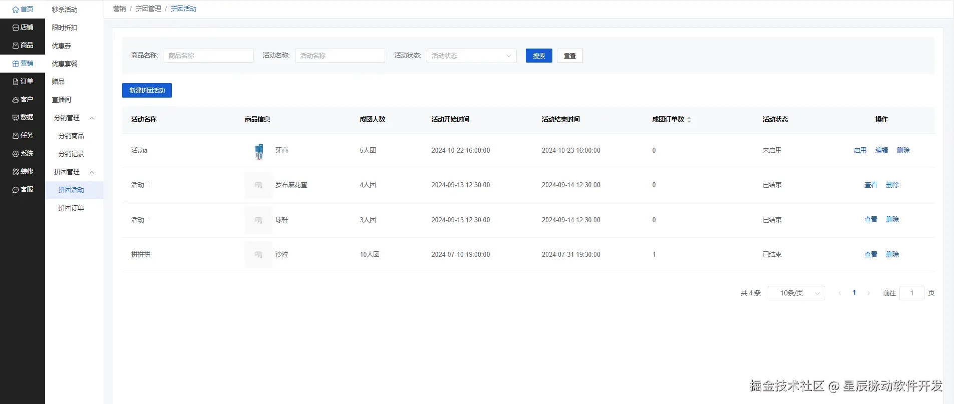 点击新建拼团活动弹出填写拼团活动内容,包括活动名称、时间,参团人数,成团有效时间等。点击启用后开始显示拼团