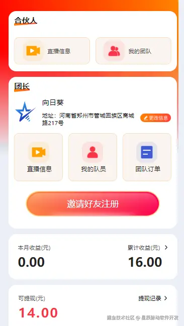 进入分销中心可以查看合伙人信息(直播信息,我的团队),团长信息(直播信息,我的团队,团队订单),本月累计收益,可提现金额,推荐团队等