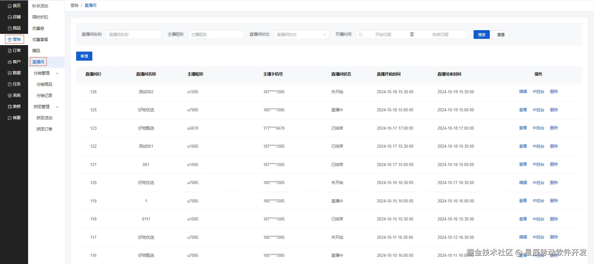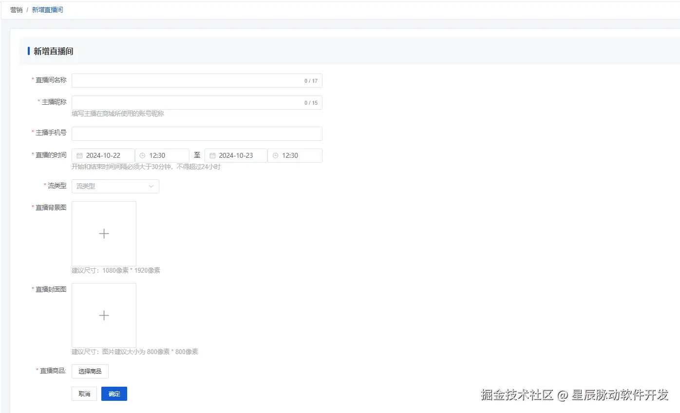 点击新增可以设置直播间,包括直播间名称、时间、背景图、封面图、商品,主播昵称,主播手机号。新增完就可以在列表查看新增的直播间,可以编辑删除直播间的信息,